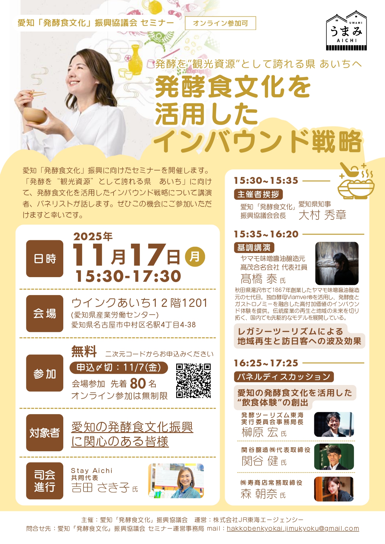 この取組の一環として、協議会構成員始め、愛知の発酵食文化振興に関心のある皆様を対象に、愛知の発酵食文化やインバウンドマーケティングに関する学習機会の提供を目的としたセミナーを開催しますので、お知らせします。