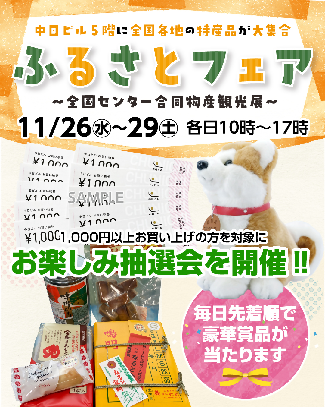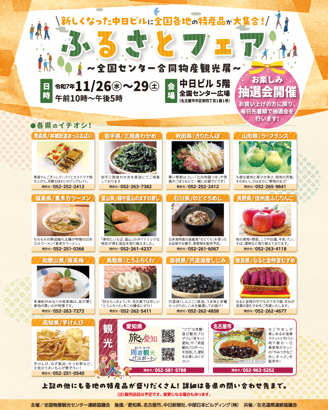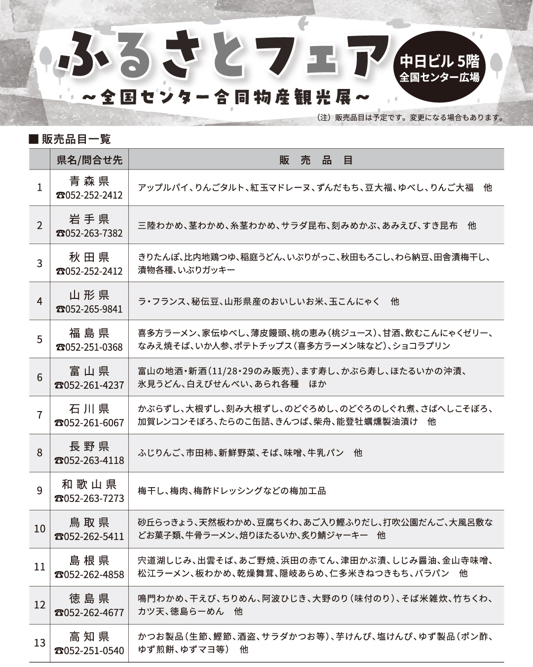 中日ビル5階に入居する各県からなる全国物産観光センター連絡協議会が企画しました。13県の自慢の逸品を販売するほか、観光情報も提供します。日本各地の物産と観光の魅力がつまっているイベントにお越しください。